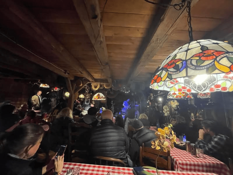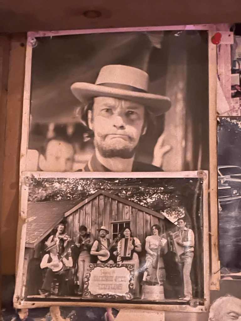 The “Tressler Barn” still bears the mark of those early Greenwich Village folk club movie scenes— red & white checkered tablecloths, old folk music posters & photos plastering the walls, basket-covered Chianti bottles, and colorful hanging light fixtures (now stained glass having replaced dilapidated collapsible paper & fringe).