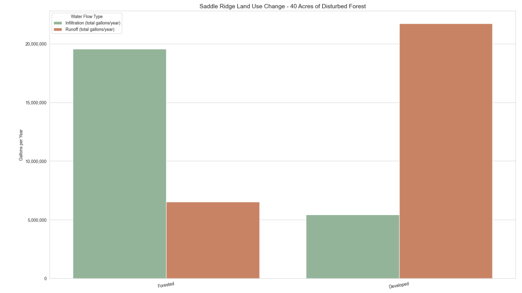 Some may argue that building fewer homes with newer technology softens environmental impacts. But the truth is, it’s the land use change in and of itself that sends shockwaves through the local water cycle. The clearing of trees for foundations, carving roads and driveways through the once spongy forest floor all take their toll. The 2017 hydrologic evaluation for the site shows how delicate the property is, even under normal rainfall assumptions. Sprinkle in a future of longer droughts, more erratic and intense storms, and ever-increasing heat.