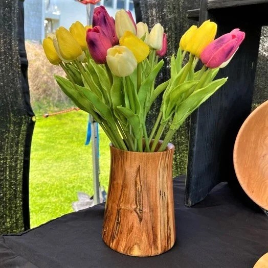 Living in Easton, Steve has always had ample access to firewood. In 2014, he brushed off the old lathe and started turning again. He made small simple bowls at first, and would give bowls away to friends and family, but the bowls and other turnings began to accumulate around his house.