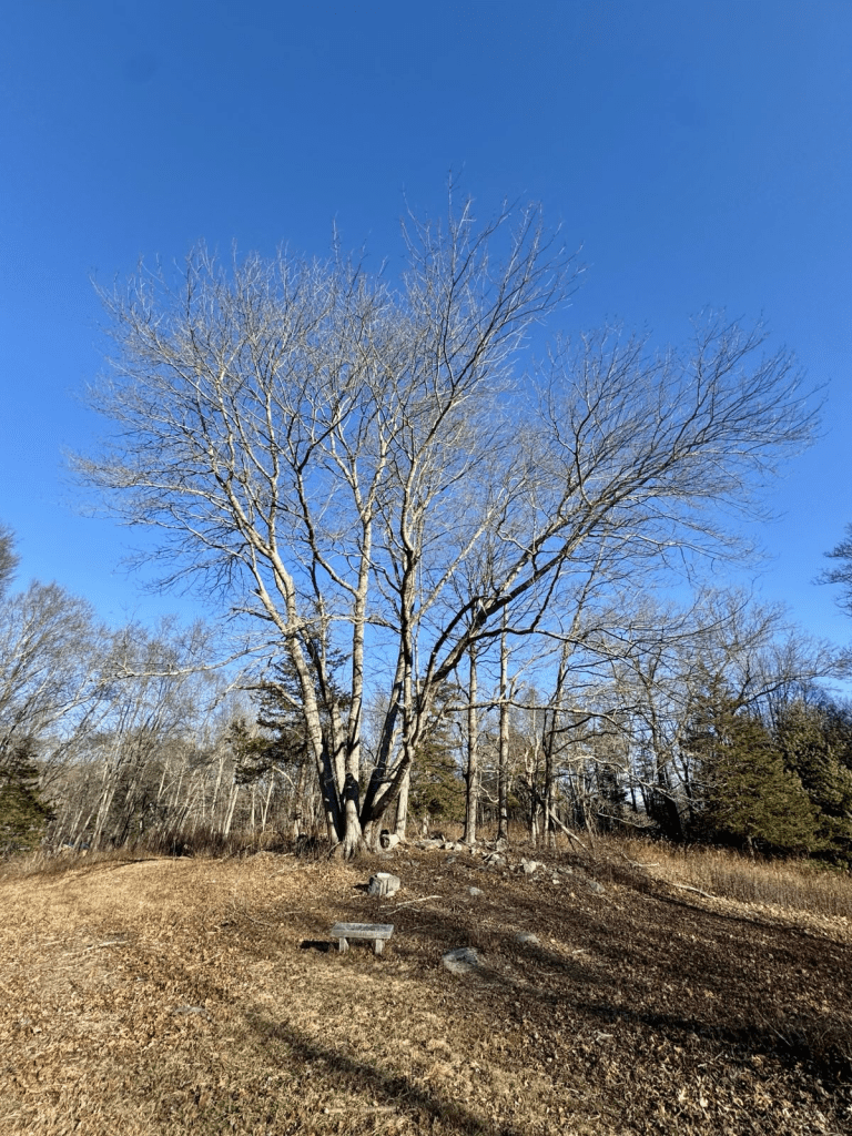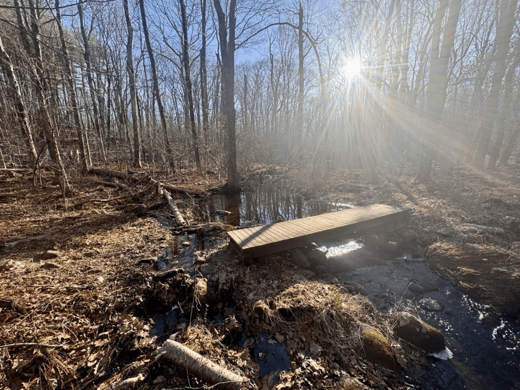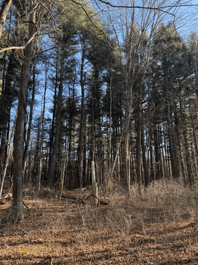 I walk on the soft pine needle trail. The air is very fresh here, and you can smell the hint of pine. It’s early afternoon now, and the sun cuts through the trees. The glare makes it hard to see what’s ahead in the forest. The trail is slightly uphill, but super manageable, even for those with limited hiking abilities. It’s not all that far from civilization, as you can see houses from the trail, especially given that there are no leaves on the trees in the winter. Old Stone walls are a reminder of just how long people have had an impact on this land. They serve as an important reminder of why places like this should be protected and preserved.