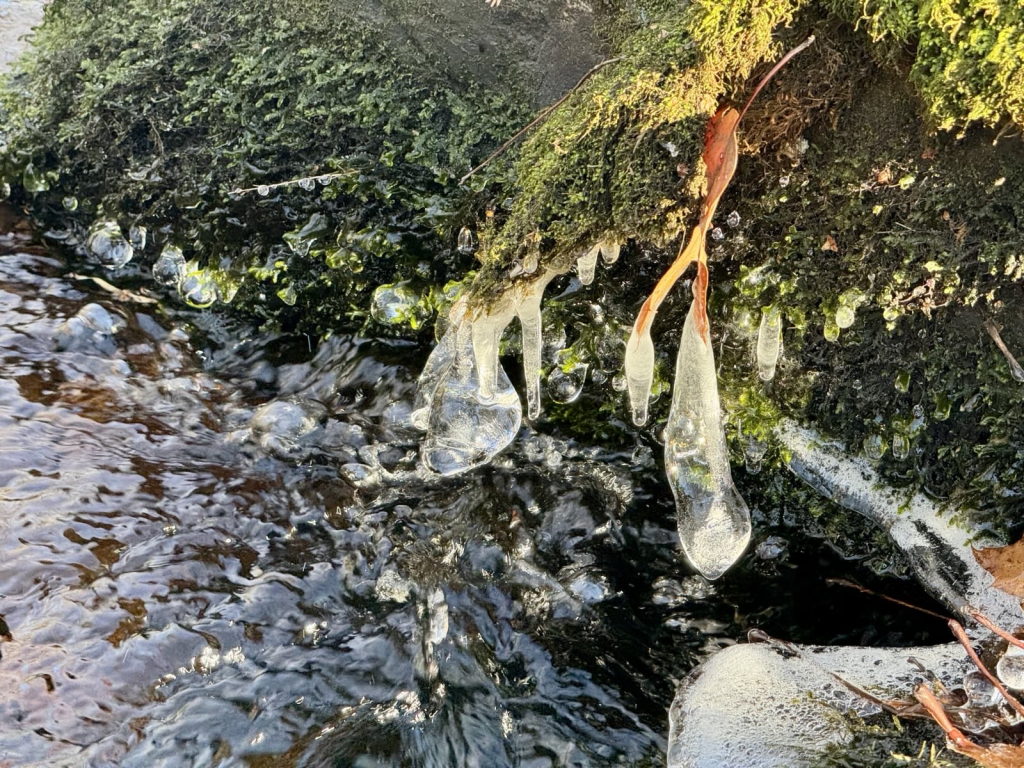 As I exit this section of pine trees and start to approach the stream, the call of a raven echoes through the forest. In the stream ice is starting to form, taking the shape similar to Christmas ornaments as the water runs freely. Soon, it could possibly all freeze, but not today. Further into the woods, a short foot bridge allows you to look at the crystal clear water down to the stream bed.