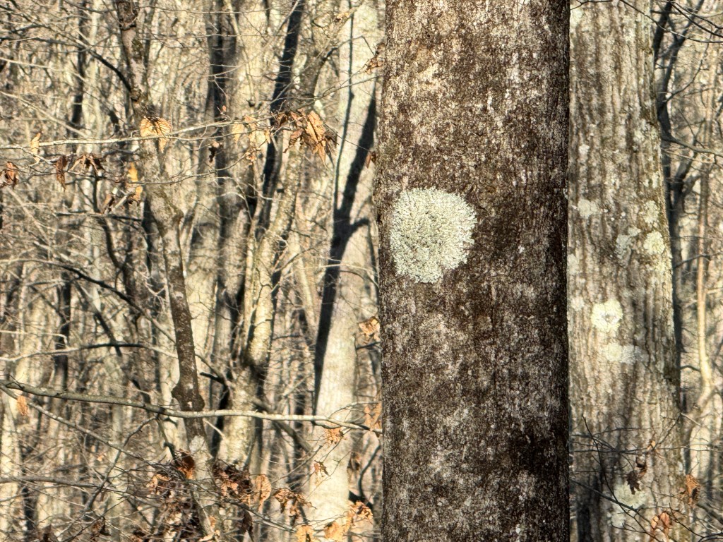 Further up the trail, after passing a meadow on the right-hand side, is Hawley’s Brook Fishway. I stopped to admire the crystal-clear water on either side of the fishway and listened to the sound of the water rushing beneath. I continued up the trail, which is mostly gravel at this point, until I spotted what I thought was a new sign on a tree. It turned out to be a perfectly round circle of lichen up in the branches.