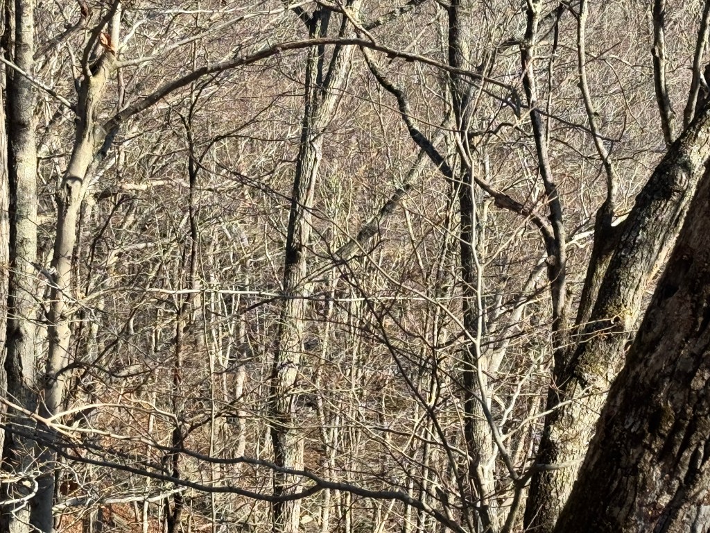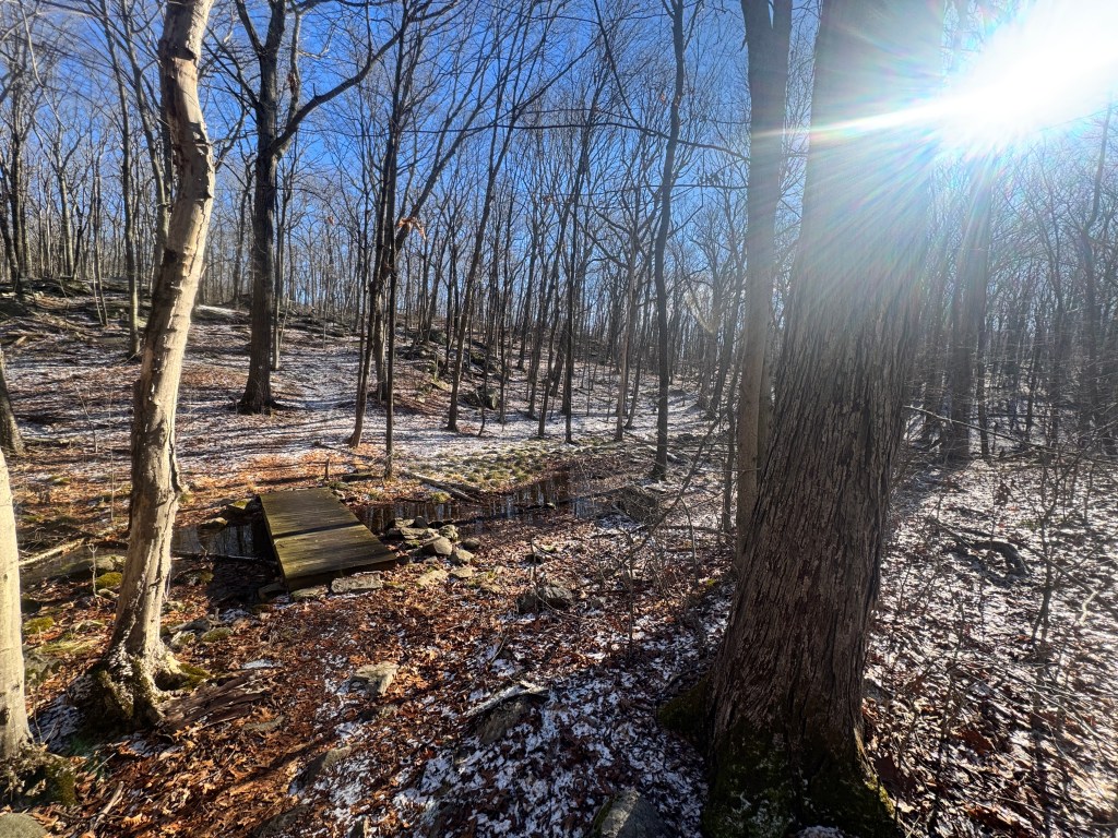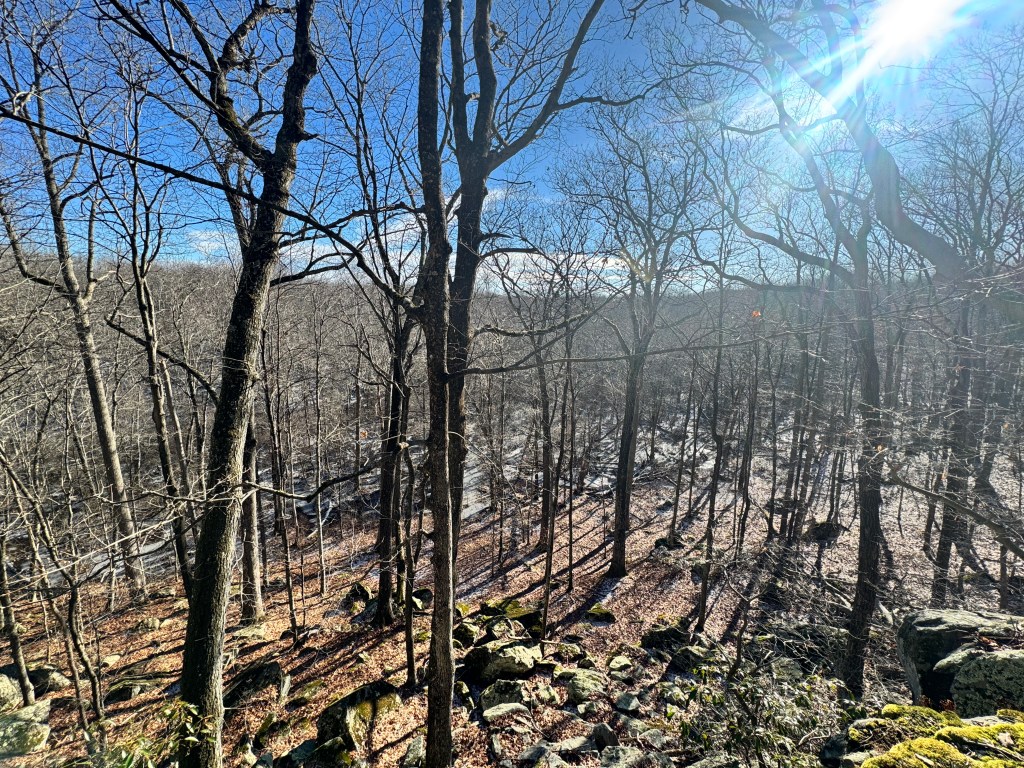 After I passed another vernal pool, this one seemingly less frozen since it’s more exposed to the sun, I took a break on a rock to check my blood sugar and look out over a ledge into another vernal pool below. Nearby, a perfectly straight branch caught my eye, a rarity in the forest’s chaos of curves.
